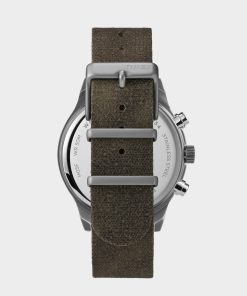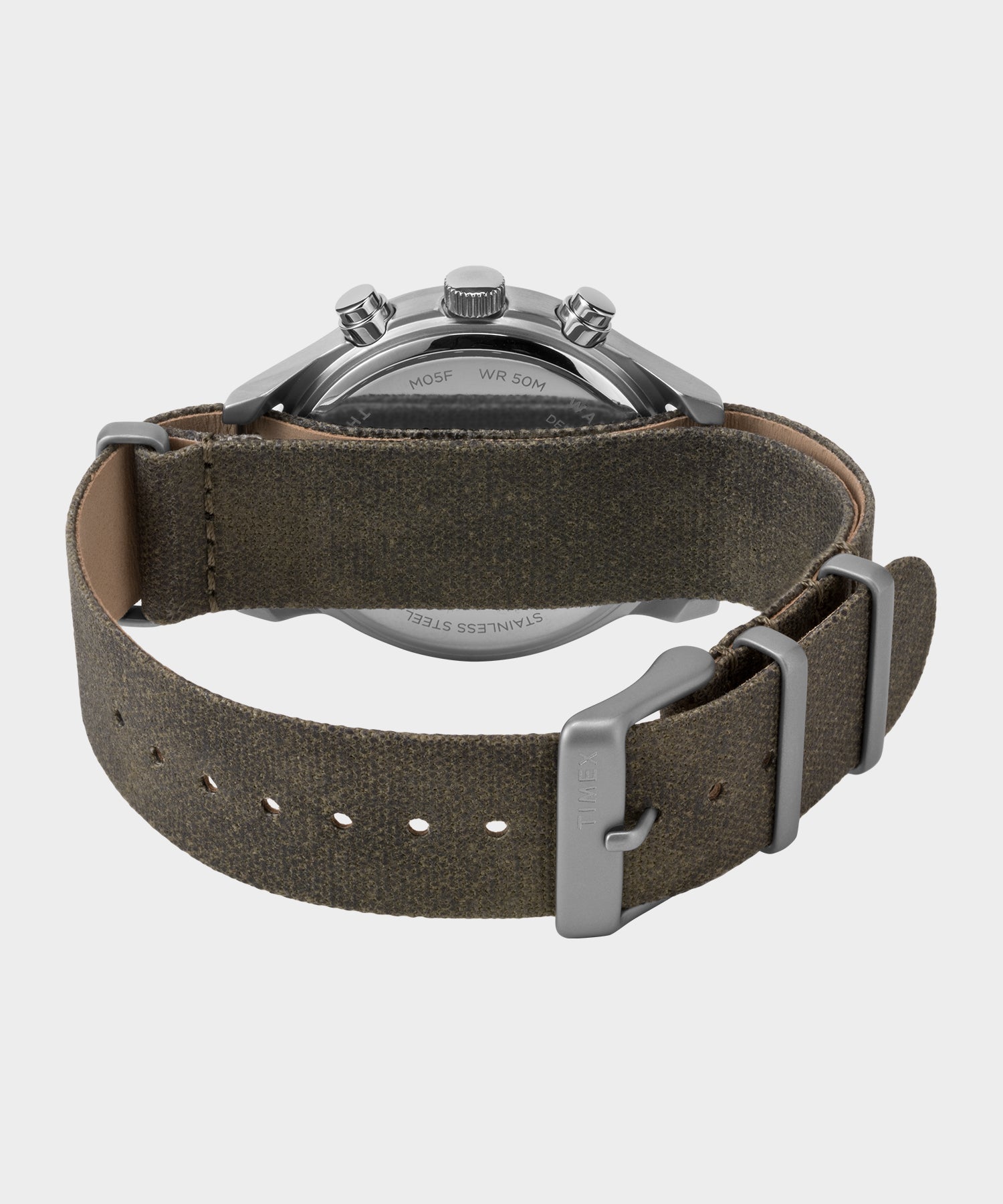 Additionally, the olive canvas strap is made of recycled clothes, finished with a genuine leather tan lining.