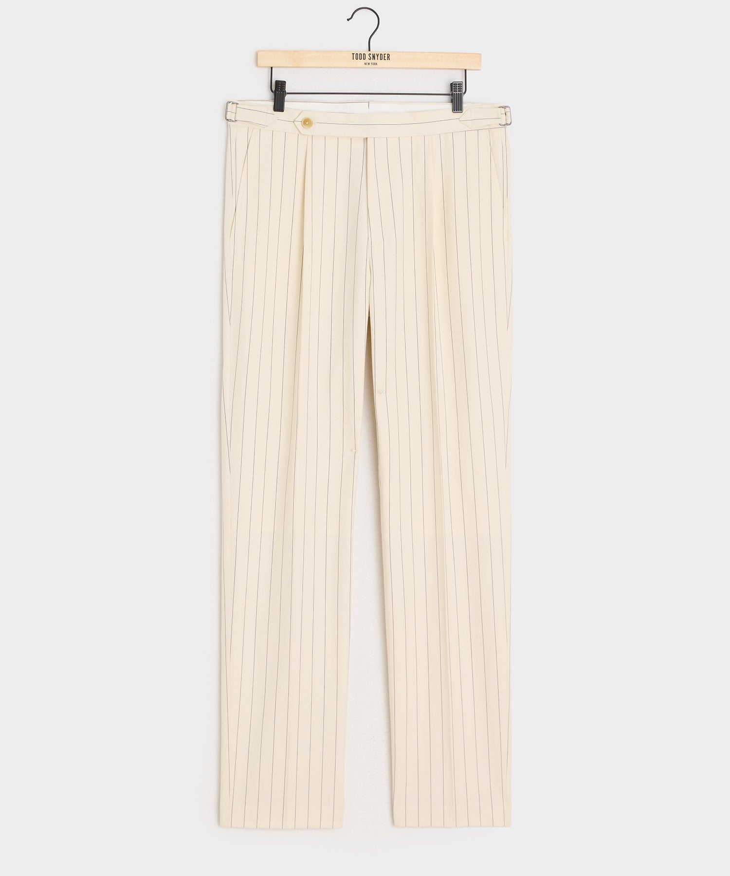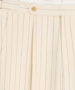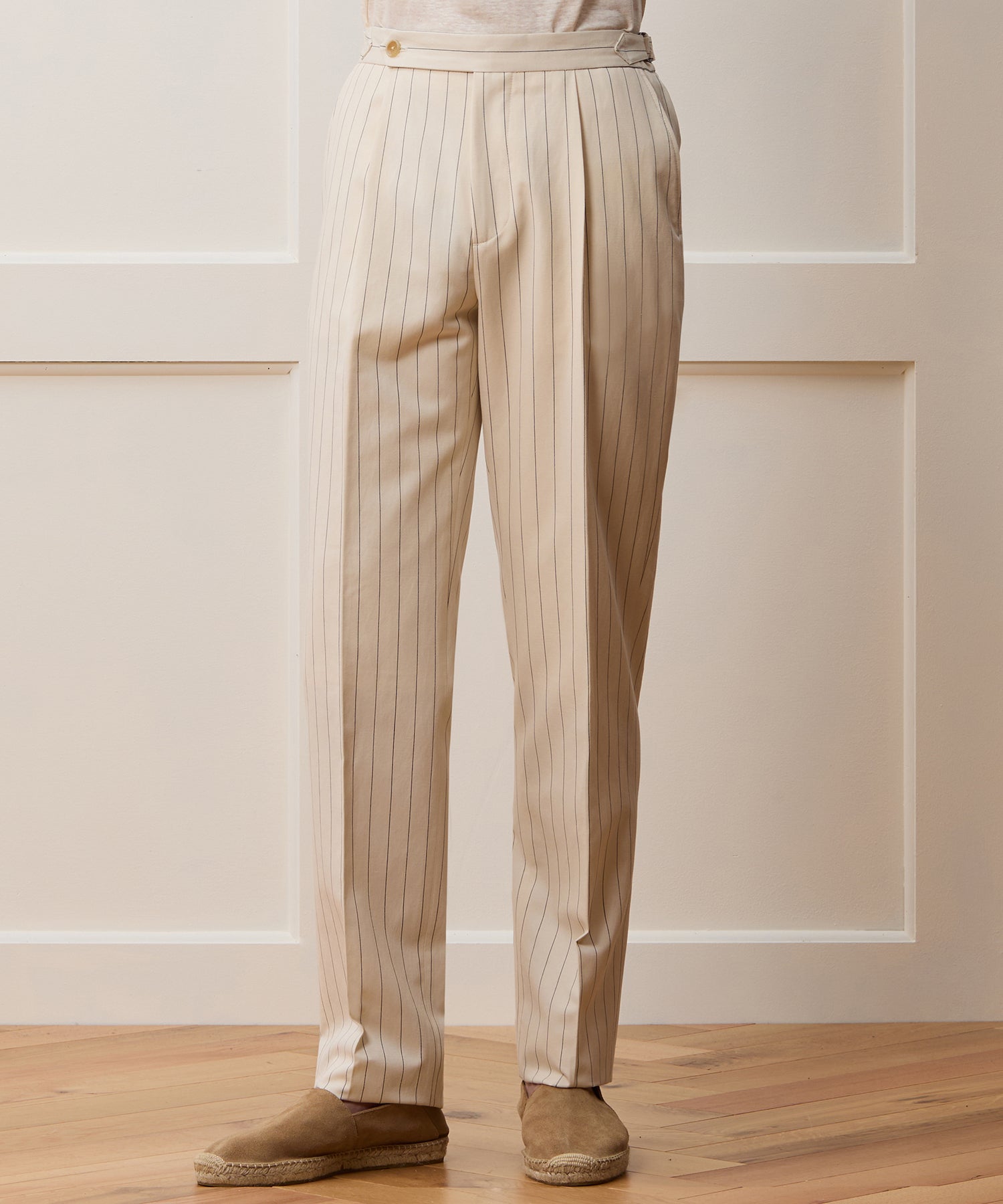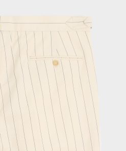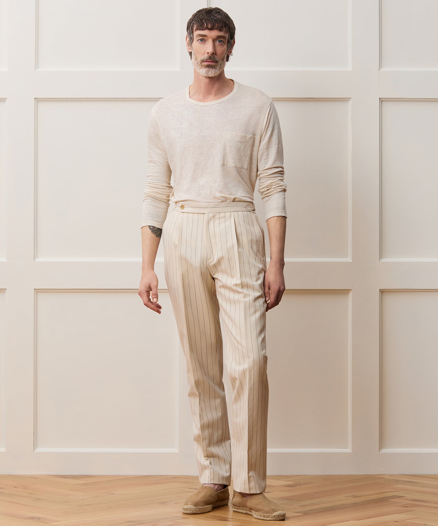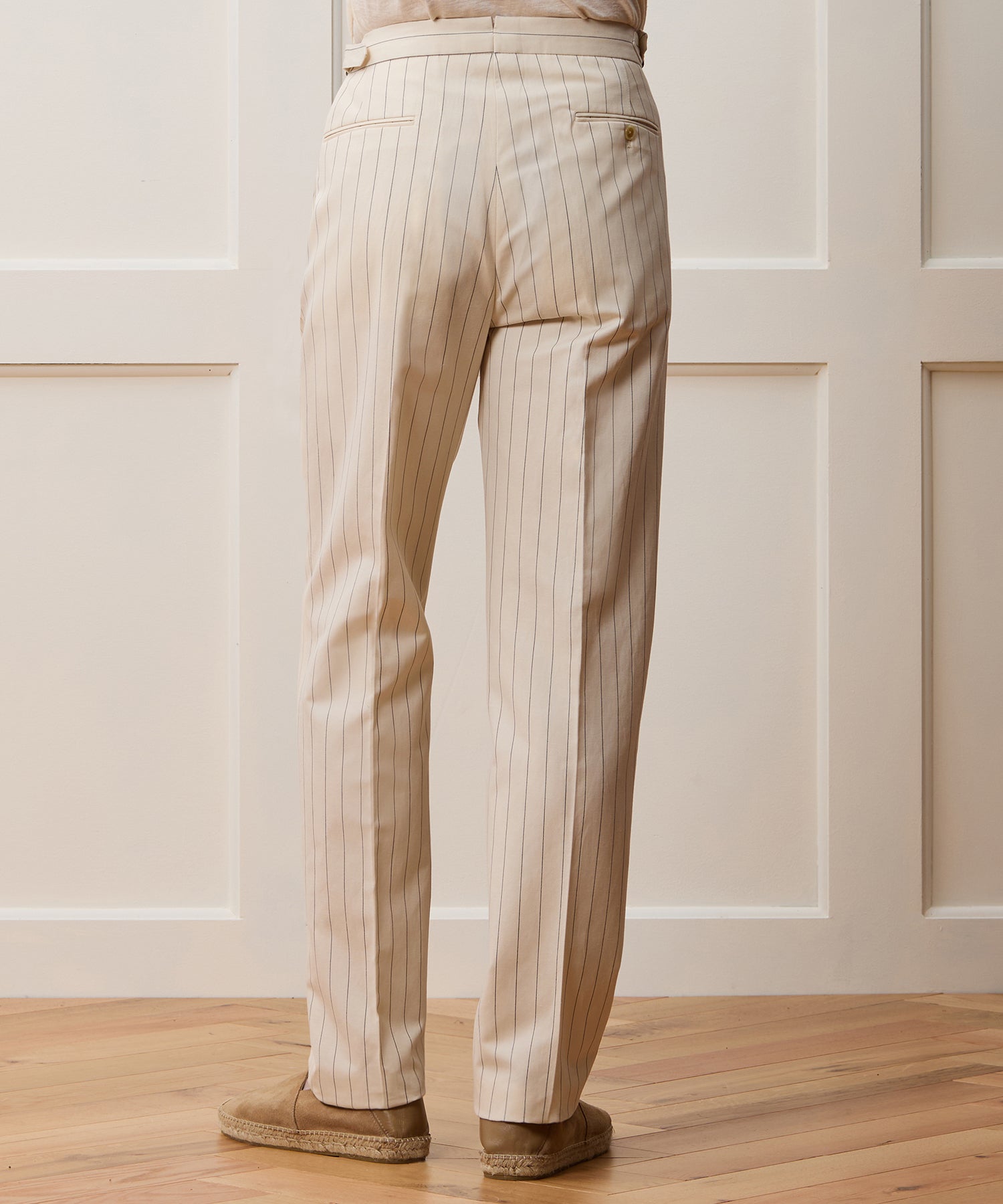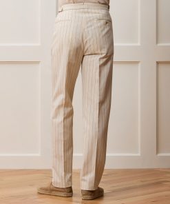 Everyone’s closet needs the perfect pair of trousers, and these certainly fit the bill. It’s made from an Italian blend of linen, silk and wool, with a crisp handfeel and a nautical-inspired cream-and-navy stripe. The silhouette has just enough on-trend fullness, falling straight through the leg, while a single pleat and crease keep things looking clean. Side adjusters and a split back at the waist complete the tailored detailing. Comfortable and chic, these versatile pants have become one of our newest go-to’s.