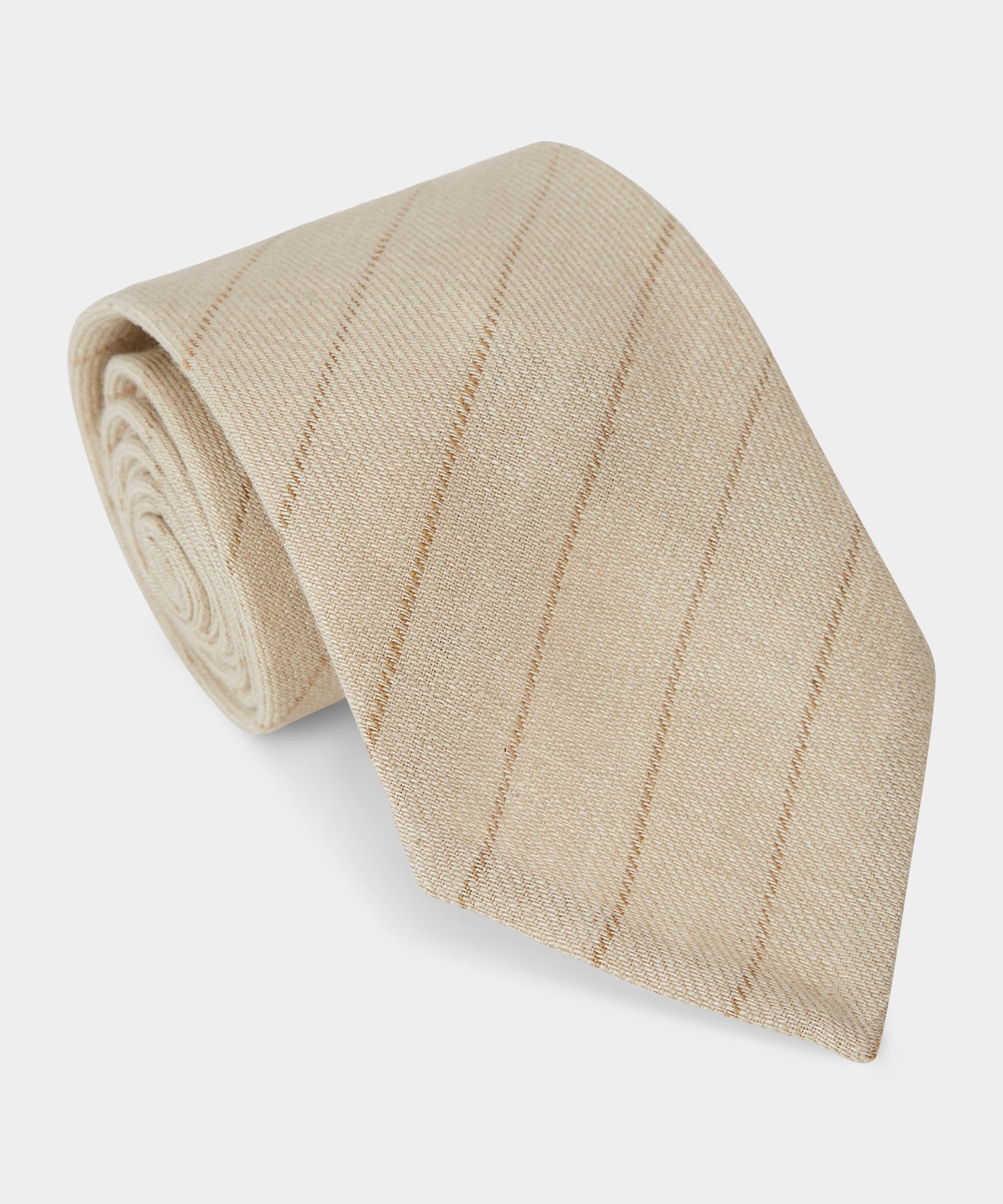 Our hand-stitched and untipped ties are constructed in Italy, and pair perfectly with any suit, sport coat or jacket. This particular tie is made from a blend of linen and silk, in a sand color with classic pinstripes in a darker tan hue.