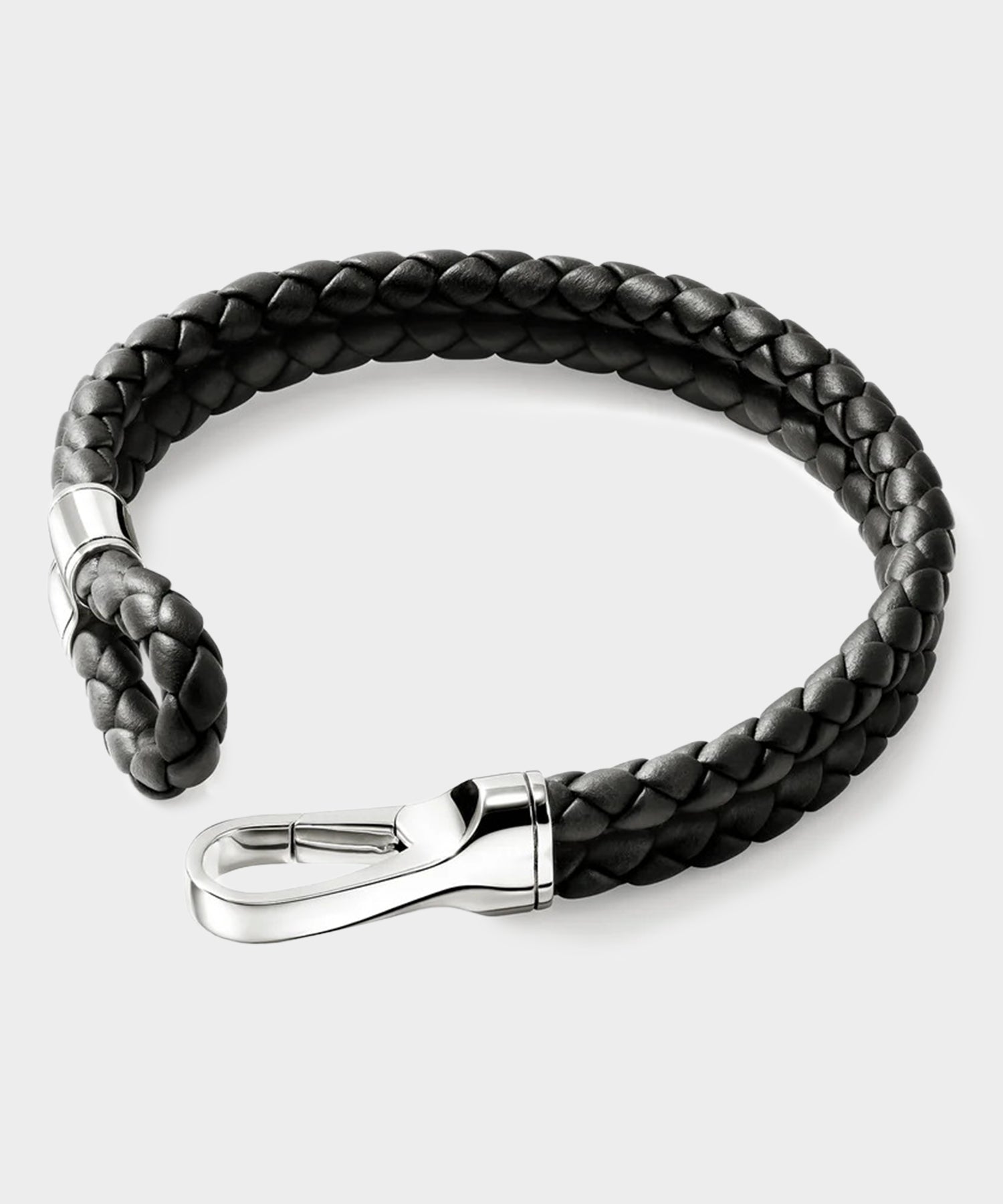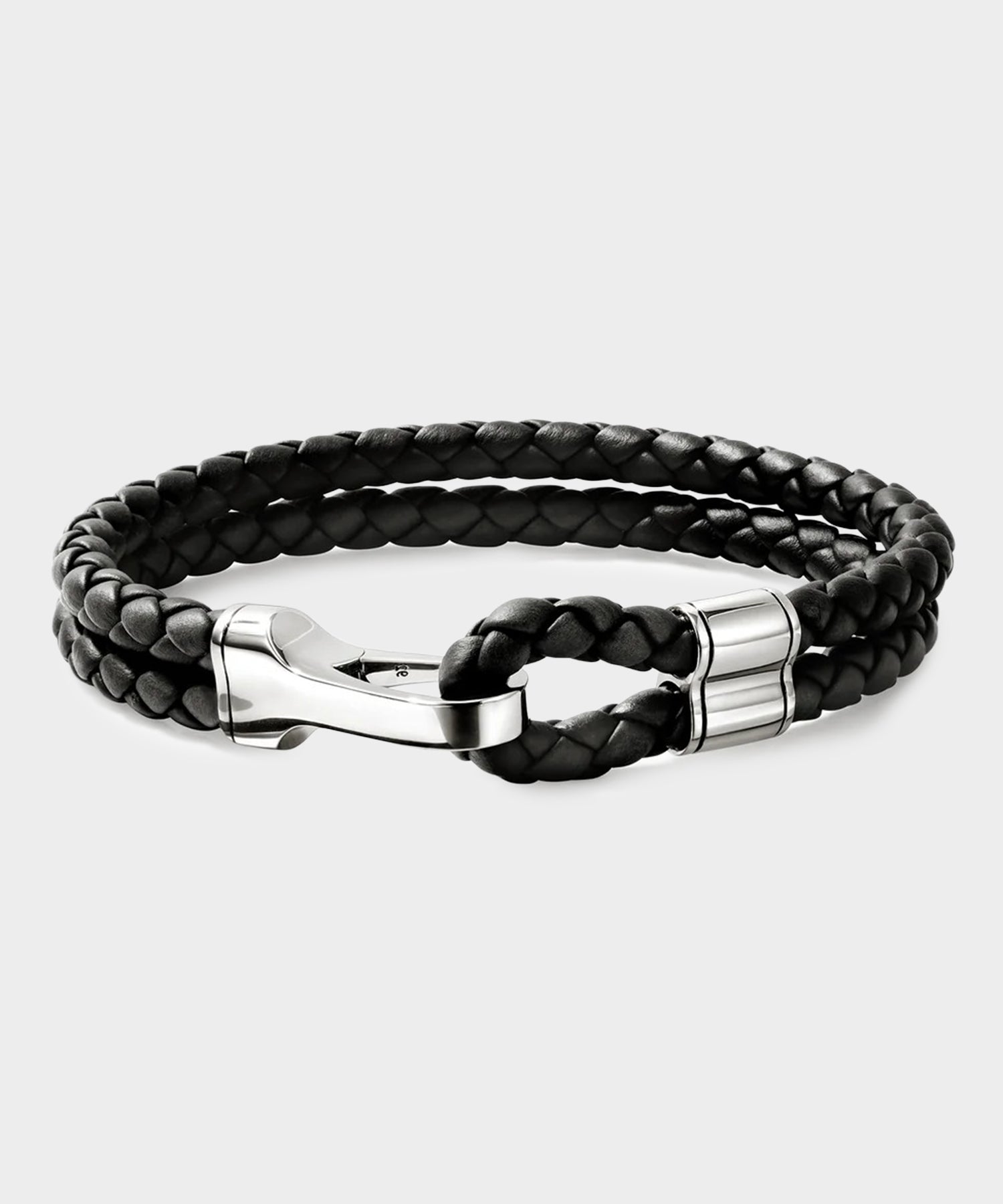 A soft braided leather bracelet, anchored by a reclaimed sterling silver hook clasp
