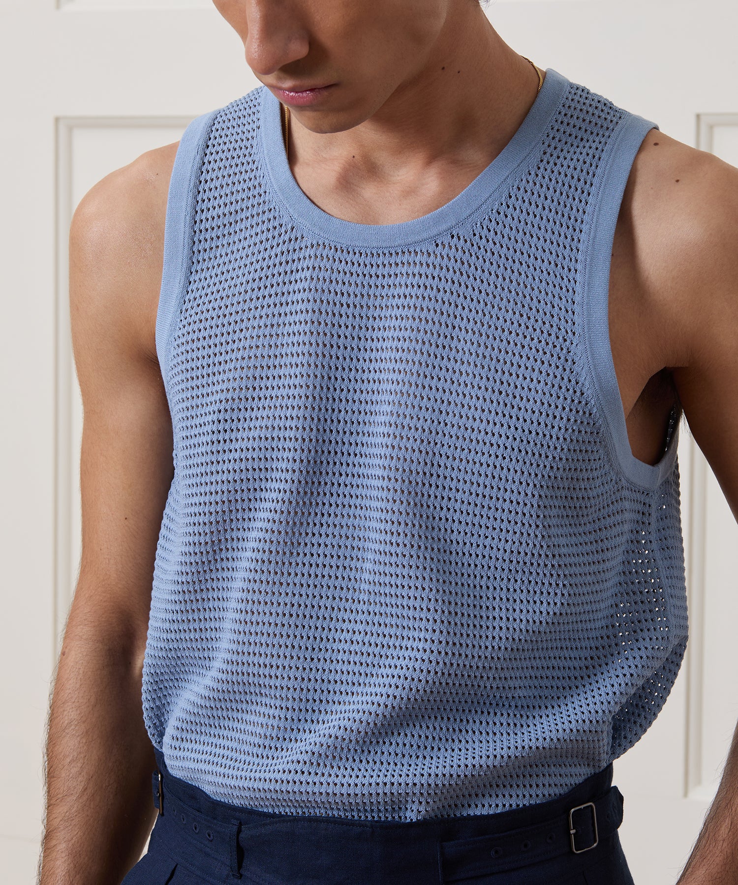 Mesh is having a moment. Todd designed this subtle nod toward the trend that’s solid enough to wear on its own and a great way to add texture to your looks as a baselayer, it’s an extremely versatile (and fashion-forward) layering piece. It’s made from a blend of cotton and nylon — the cotton is dry, breathable and has a natural feel, while the nylon keeps the fine mesh stitch tighter and lighter than pure cotton would allow for. This tank has a slim (but not tight) fit that looks especially chic tucked into high-waisted pleated pants. FYI: the tank top is named after a sleeveless bathing costume that caused quite a stir when it was worn by the British Women’s Swim Team at the 1912 Olympics; at the time, swimming pools were also called swimming tanks, and the name stuck.